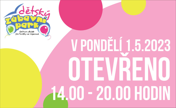 Dětský zábavní park ve Stříteži u Třebíče bude otevřen i v pondělí 1.5. a 8.5., i přesto, že jsou tyto dny státními svátky. Chceme, aby naši návštěvníci měli možnost využít našich atrakcí i během těchto svátečních dnů, a proto budeme mít otevřeno jako každý běžný den od 14.00 do 20.00 hodin. Těšíme se na vaši návštěvu a přejeme vám spoustu zábavy!