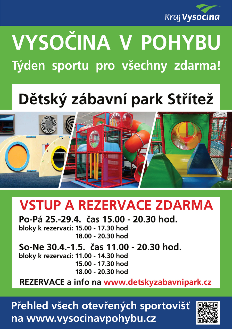 V příštím týdnu od pondělí 25.4. do neděle 1.5. jsme se zapojili do projektu Kraje Vysočina „ Vysočina v pohybu“ a budeme mít jednak otevřeno denně celý týden, ale také bude vstup do herny BEZPLATNÝ úplně ZADARMO