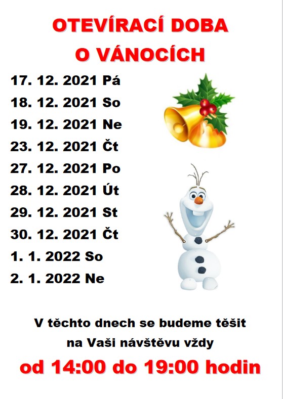 V letošním roce jsme rozšířili pracovní dobu v našem dětském zábavním parku a kryté herně o vánočních prázdninách vždy v době od 14.00 do 19.00 v tyto dny: