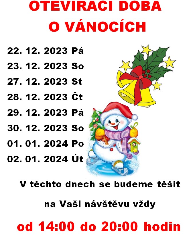 Provozní doba herny zůstává jako v průběhu celého roku vždy od 14.00 do 20.00 hodin. Zábavní park s dětskou hernou bude otevřený celé vánoční prázdniny mimo 24., 25., 26. a 31.12.2023